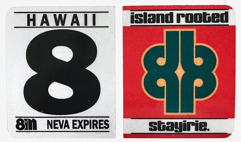 PUT DAT ISLAND CHECK ON! 8MIB Reflective Vinyl Stickers inspired by the OG Hawaii Safety Check stickers. Design consists of the number '8' which is the number of Islands in the Hawaiian Chain. The IB logo (right sticker) represents the fusion of Island and Mainland lifestyles with an Island State Of Mind. Comes in a pair. Exact size as the original safety checks.